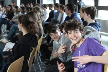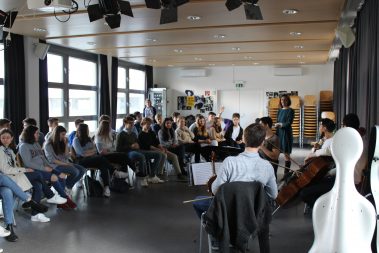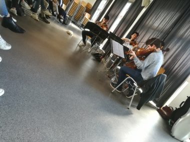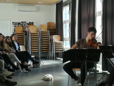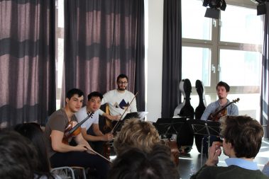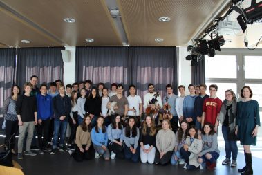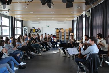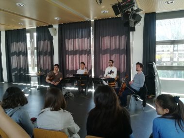 Französisch-Unterricht etwas anders: Die Klassen 6B (Mag. Petra Lukas-Kickinger) und 6C (Mag. Katharina Tanzler) bekamen am Dienstag, 12.3.2019, musikalischen Besuch von den Rising Stars ‚Quatuor Arod‘, die am Vorabend noch im Musikverein konzertierten. Hautnah an wunderbarer Kammermusik, hautnah an französischsprachigen Originalen – c’était magnifique!